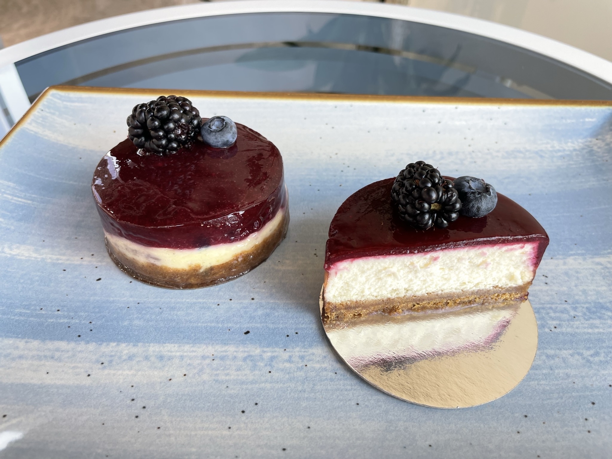 160 gr – Cheesecake conține blat de biscuiți digestivi cu unt, cremă de brânză, jeleu de fructe de pădure, fructe proaspete.