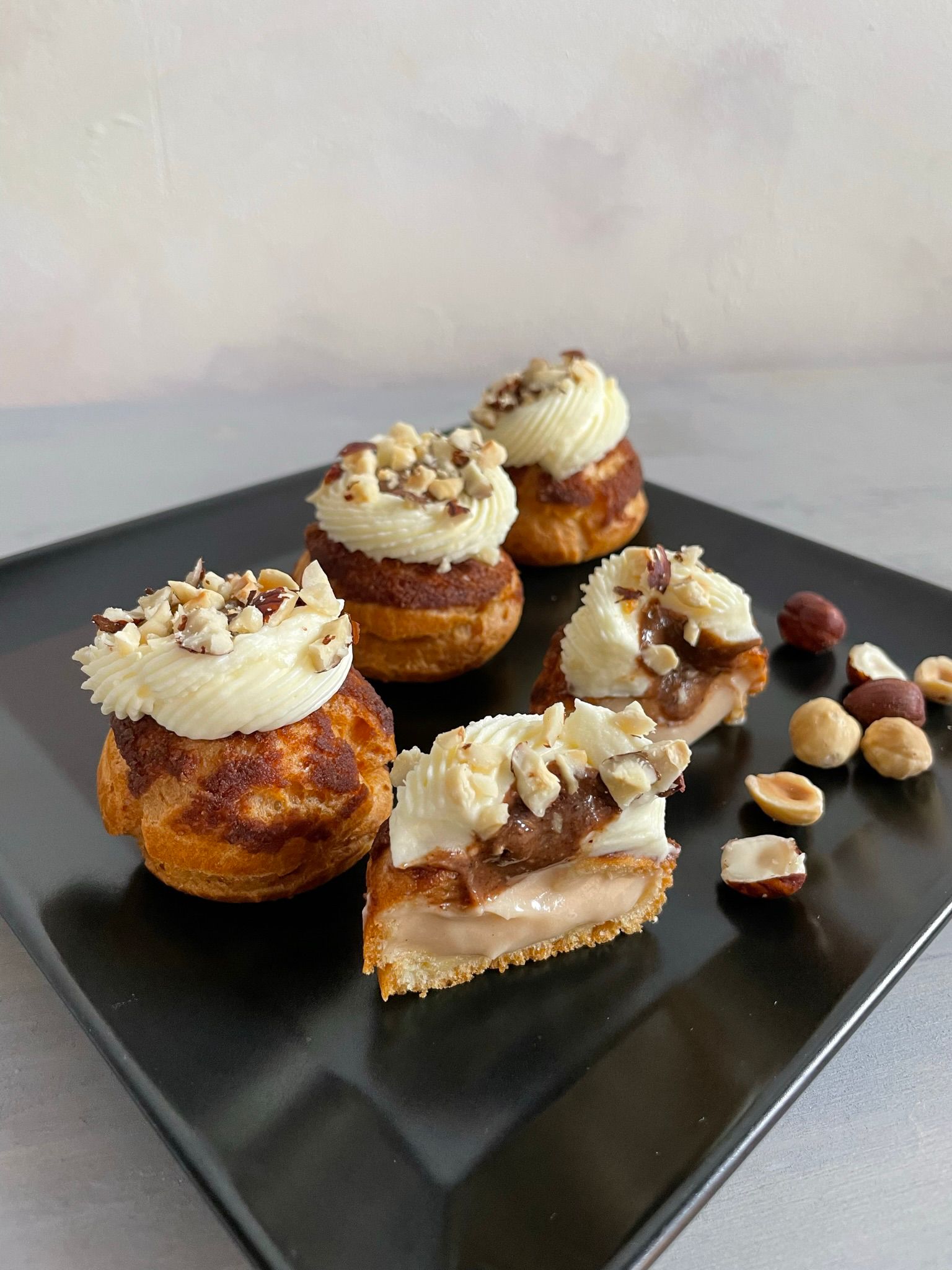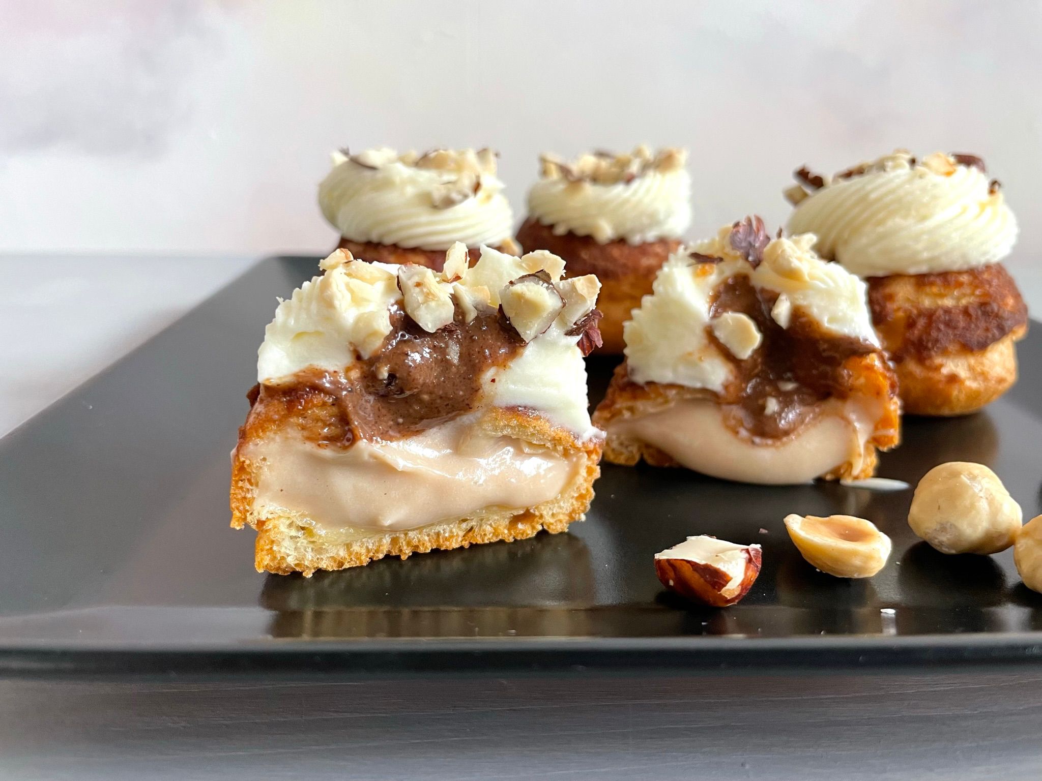 Cremă de praline, ciocolată albă și inserție cu pastă de alune de pădure.