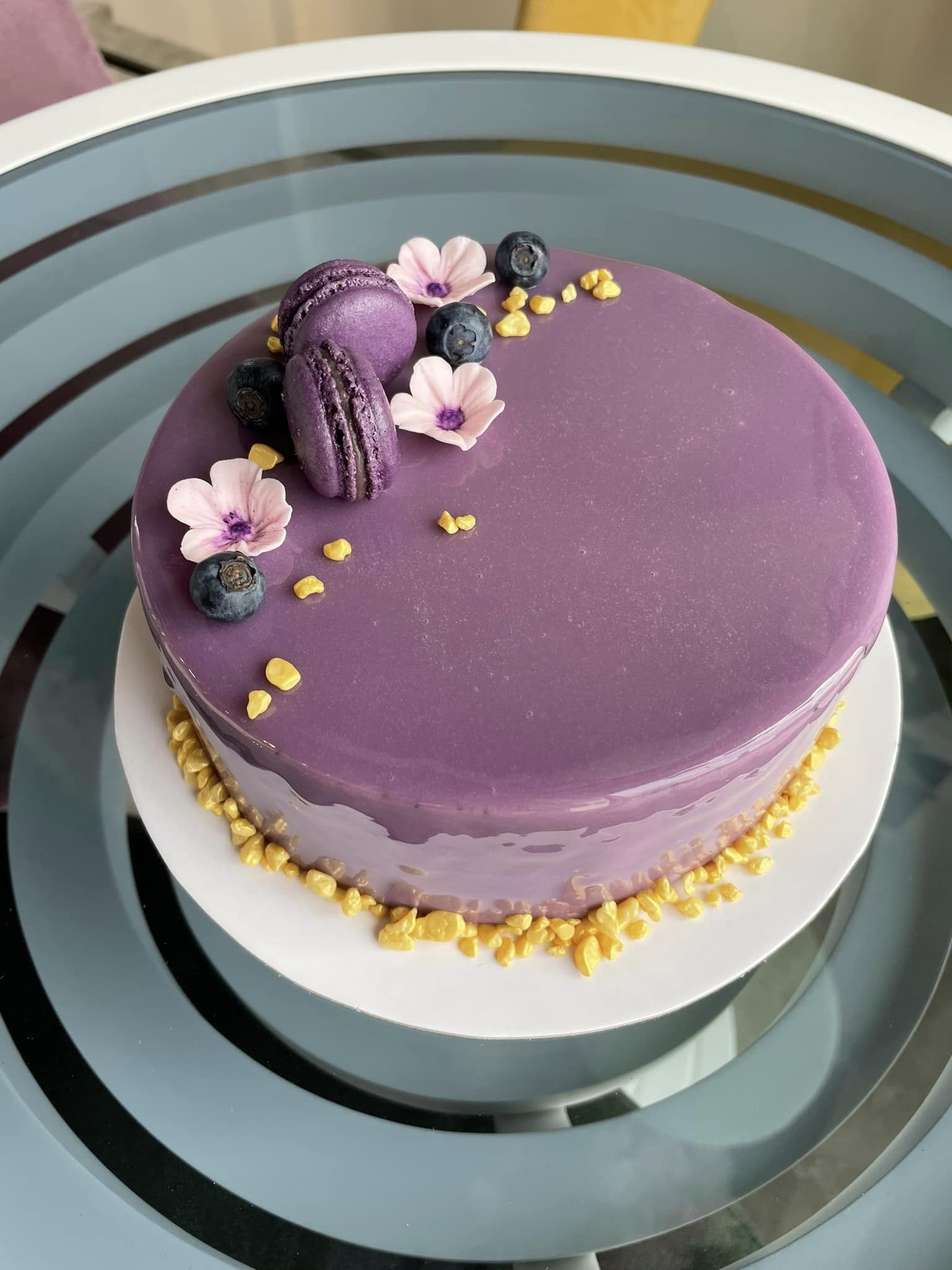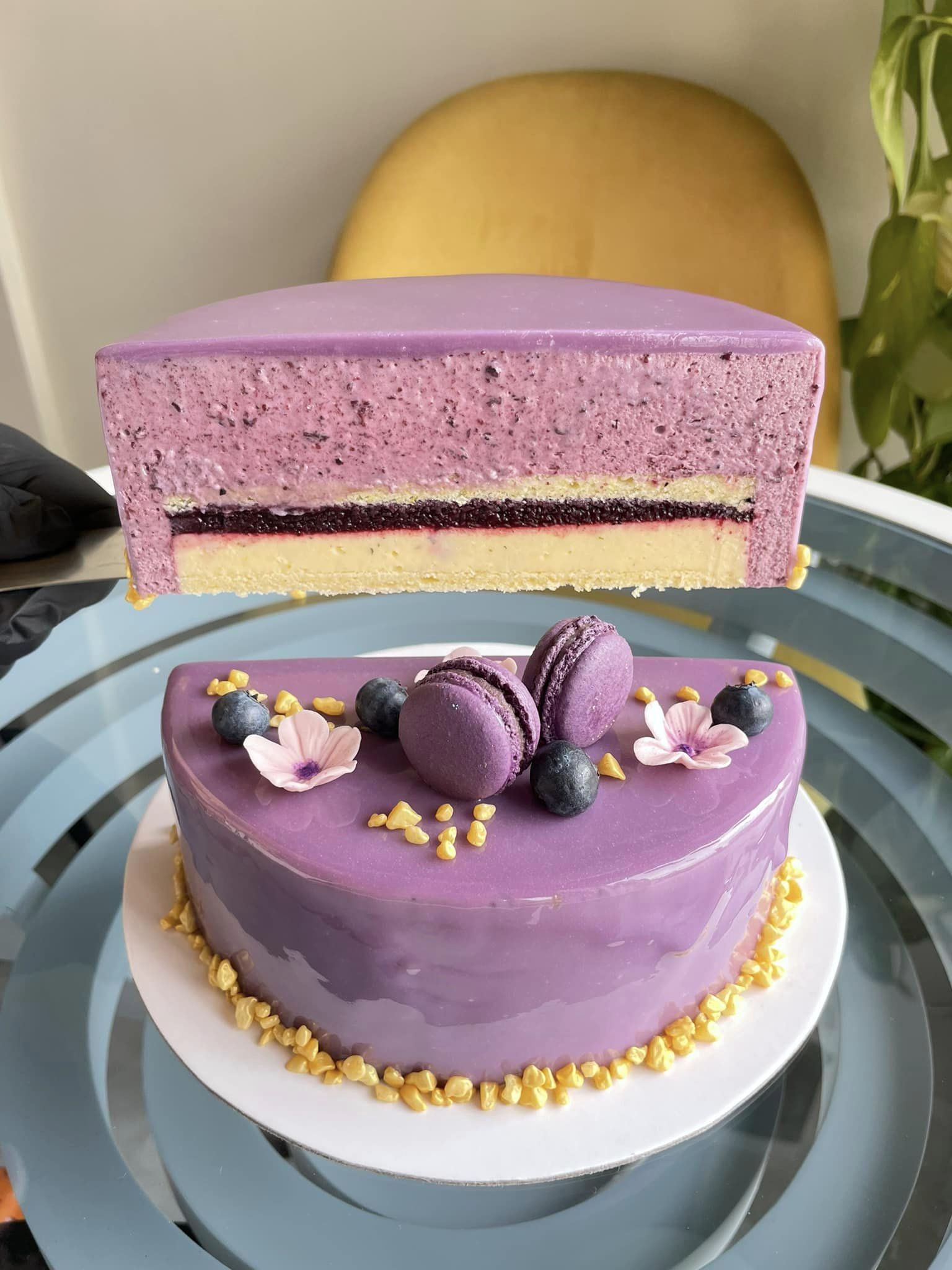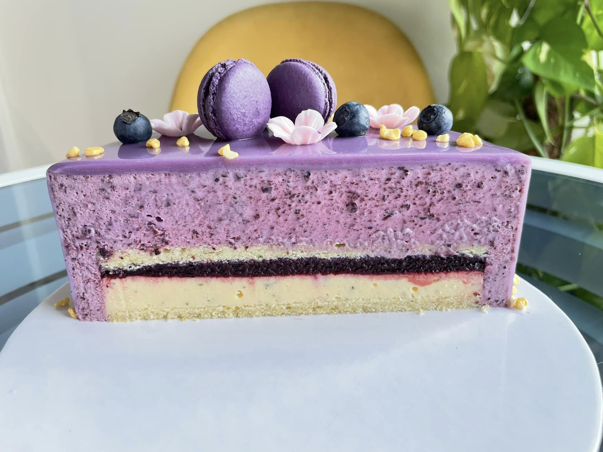 Blat de vanilie cu lime, inserție cu cremos de lime, mentă și jeleu de afine, mousse cu piure de afine și lavandă.