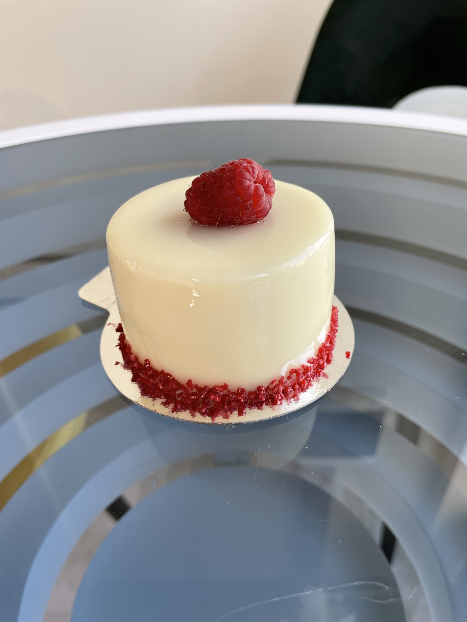 Prăjitura Exotic conține blat joconde cu faina migdale și lămâie, inserție cu cremos de fructul pasiunii și jeleu de fructe de pădure, bavareză de ciocolată albă, glazură oglindă.