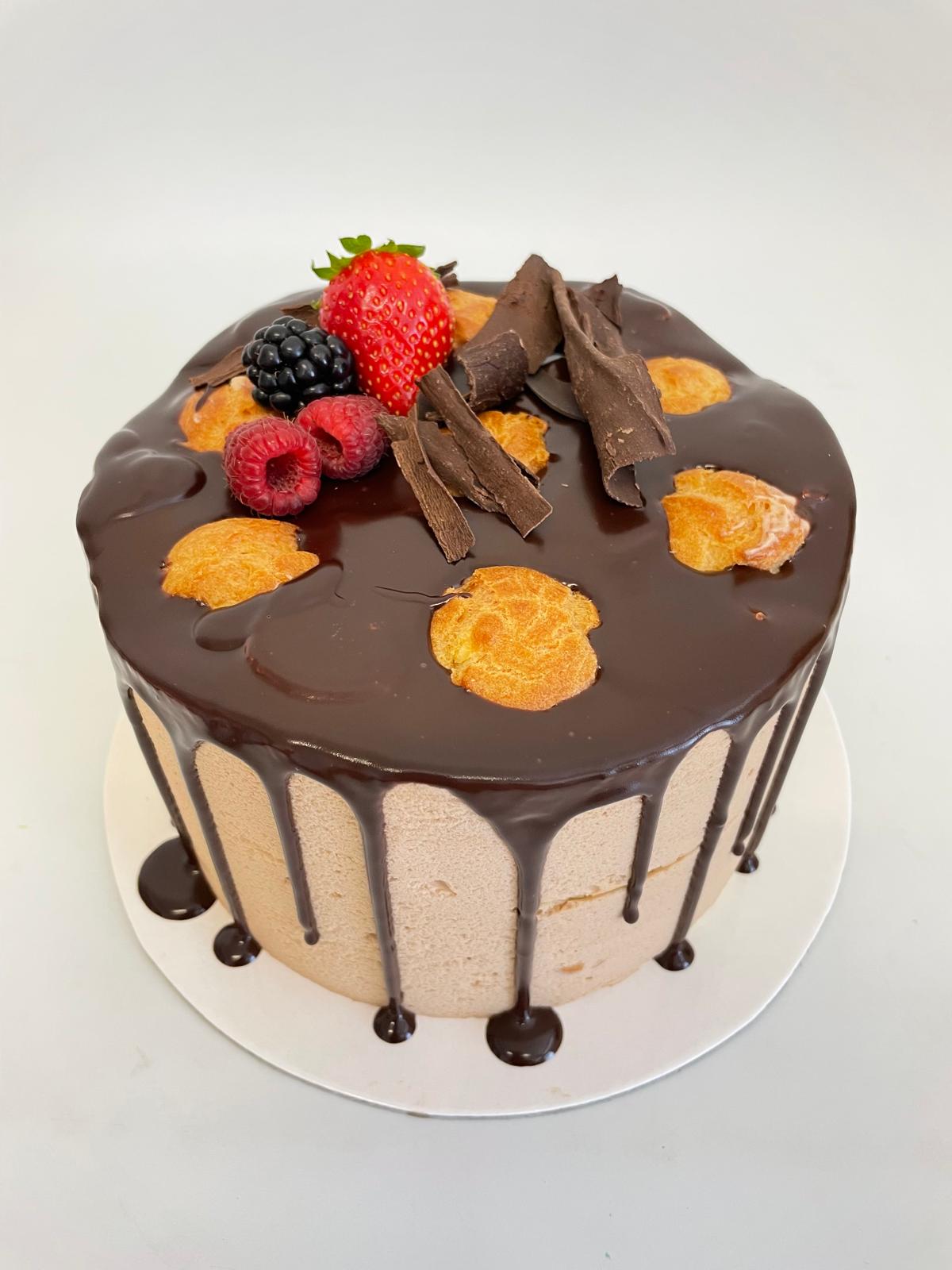 Mousse de ciocolată cu lapte pralinat, mini choux cu vanilie, blat subțire de vanilie, glazură de ciocolată neagră.