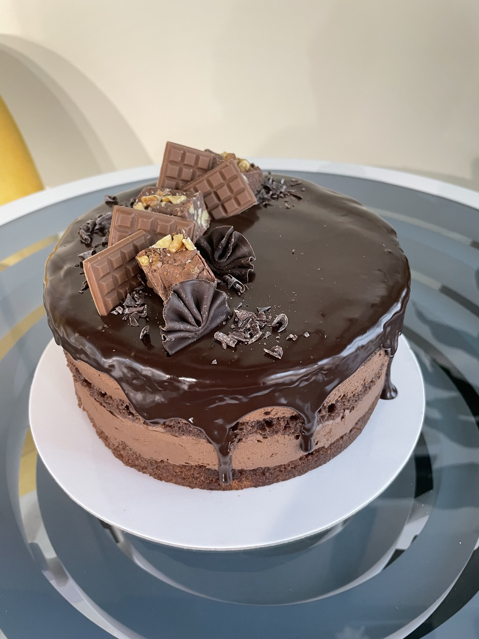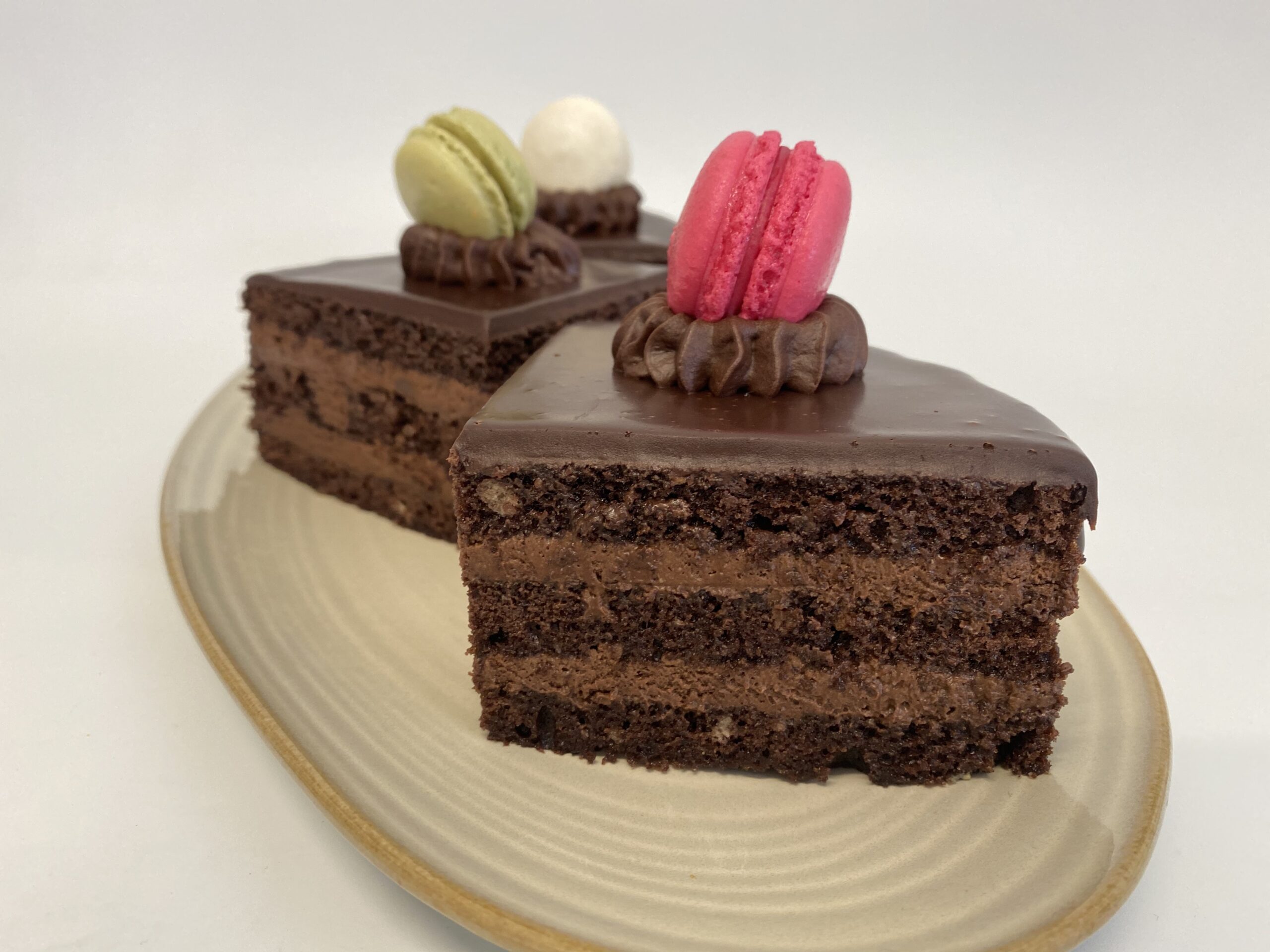 Cremă de ciocolată neagră 58% și frișcă naturală, blat de cacao însiropat, glazură de ciocolată neagră.